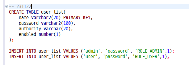 user_list 테이블을 생성한 뒤, admin과 user를 추가합니다. (password는 임시로 설정한 비밀번호)