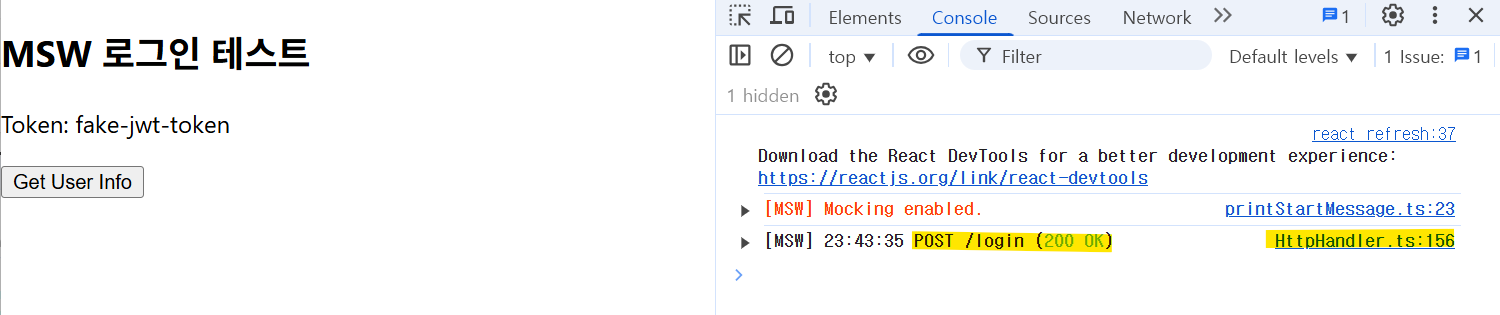 3) MSW를 이용해서 login, user API mocking을 설정 후 테스트