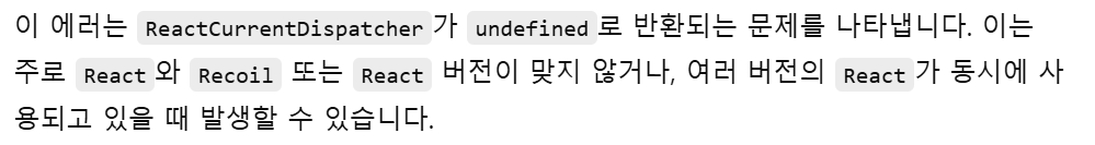 나는 해결 과정에서 다음 명령어를 통해 React와 Recoil을 최신 버전으로 업데이트했다.