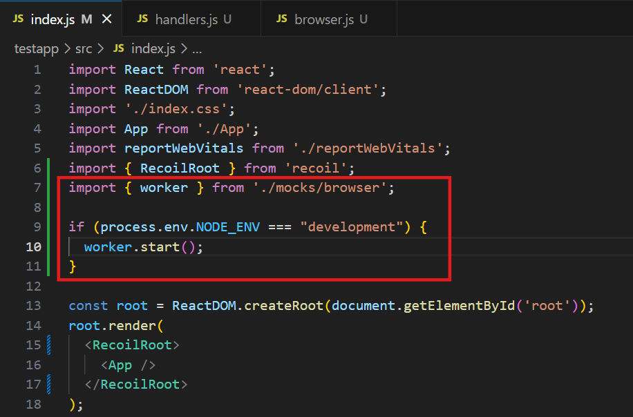 서비스 워커를 등록하고 활성화하는 worker.start()를 호출하여 워커를 시작해야 한다 . 또한, 프로덕션 트래픽에 영향을 주지 않도록 개발 환경에서만 API 모킹을 활성화한다.