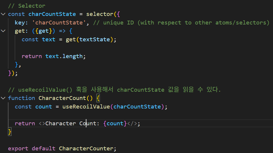 CharacterCounter 컴포넌트에서 selector를 만든다. Selector는 파생된 상태(derived state)의 일부를 나타낸다. 파생된 상태는 상태의 변화다. 파생된 상태를 어떤 방법으로든 주어진 상태를 수정하는 순수 함수에 전달된 상태의 결과물로 생각할 수 있다.